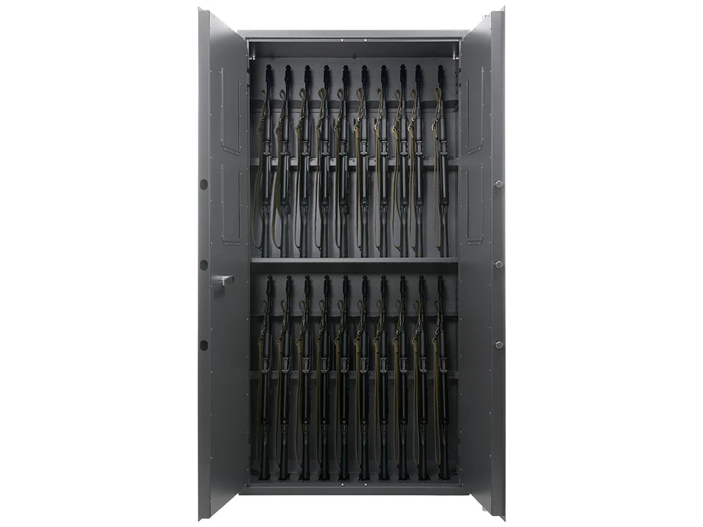 Сейф изготовлен в виде оружейного шкафа с двумя распашными дверцами. Снабжен двумя ключевыми замками и удобной поворотной ручкой, которая приводит в действие ригельную систему и запирает дверцы сейфа по трем сторонам. Корпус представляет собой сварную металлическую конструкцию, окрашенную порошковой краской нейтрального серого цвета (RAL 7024). Комплектуется 1 металлической полкой, которая образует 2 яруса(вместе с основанием) для размещения 20 автоматов Калашникова - по 10 единиц на уровень. Каждый ярус оснащен карманами под шильды для маркировки. Также на внутренней стороне дверей имеются 4 рамки для описи имущества.